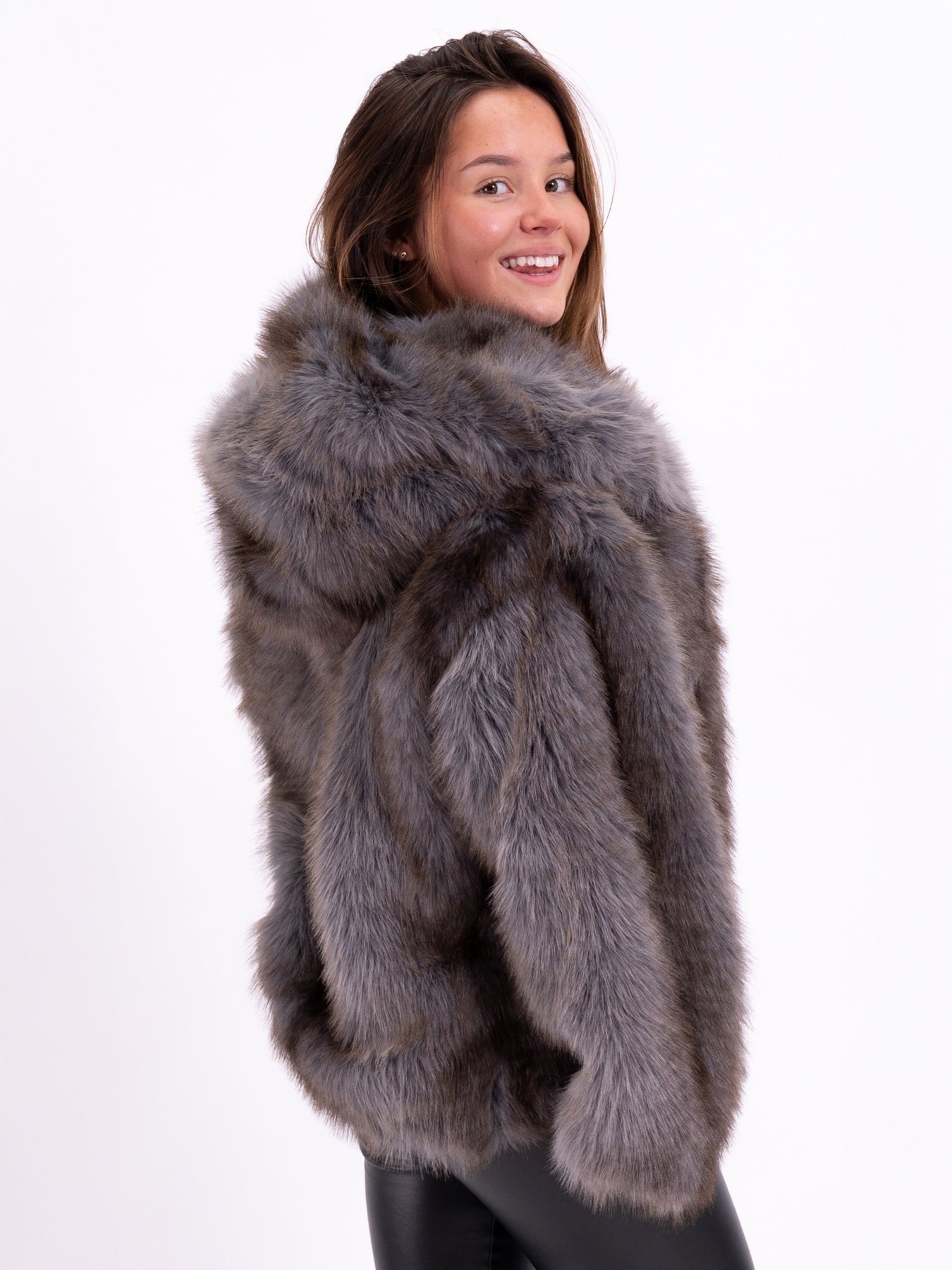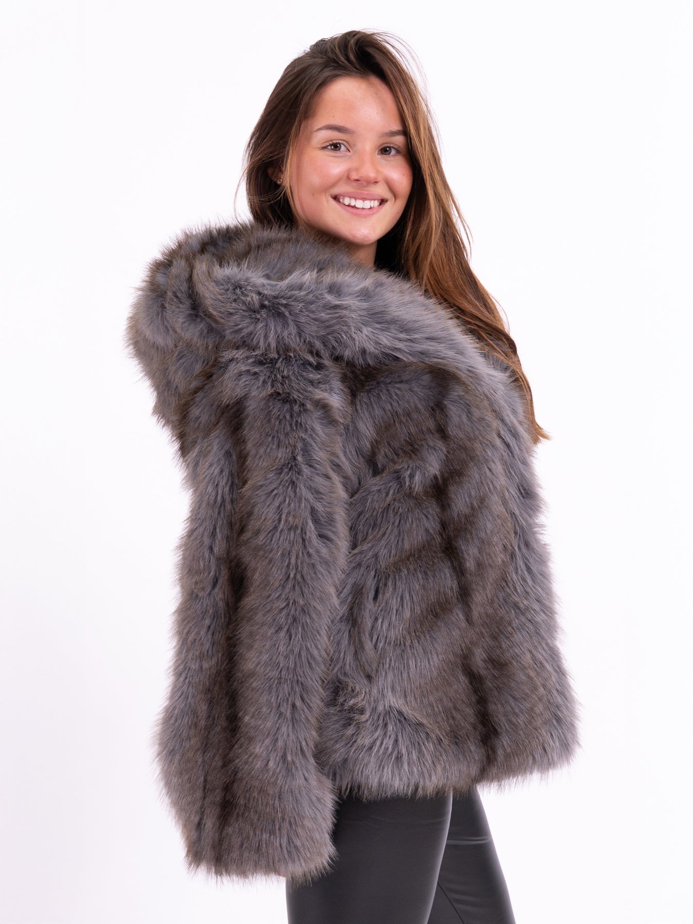 Die Kunstfelljacke Kapuze Grau ist bei Modafein erhältlich.
