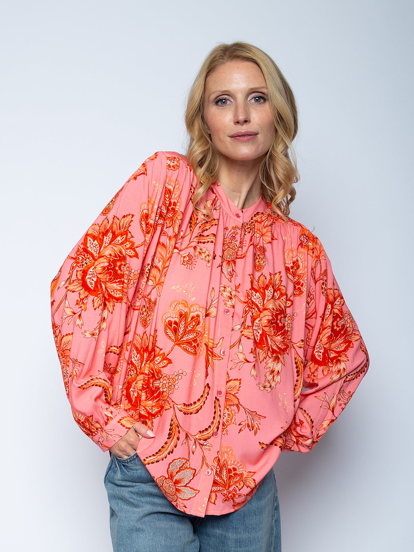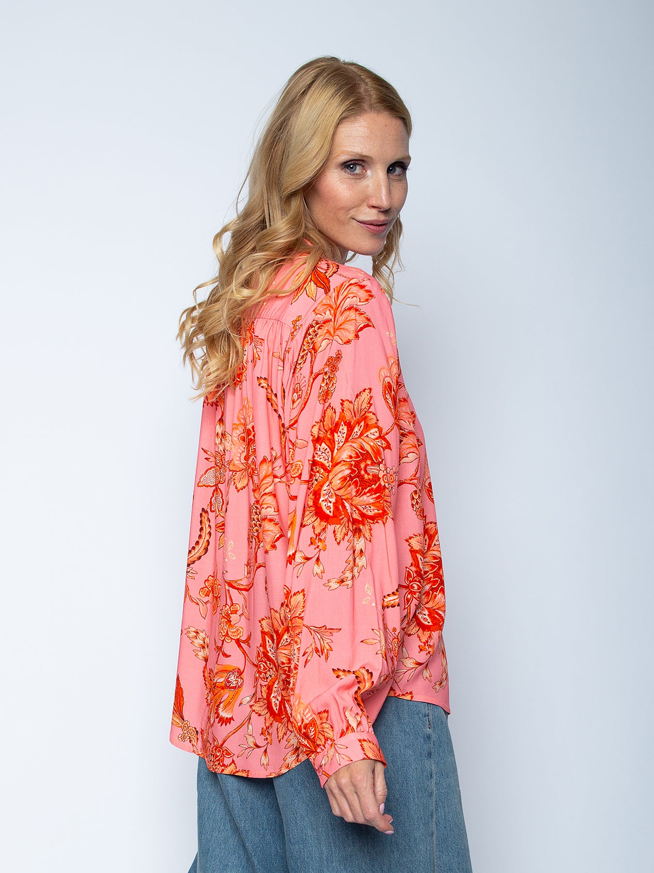 Emily van den Bergh Bluse mit kleinem Stehkragen Coral Pink Flowers erhältlich bei Modafein.