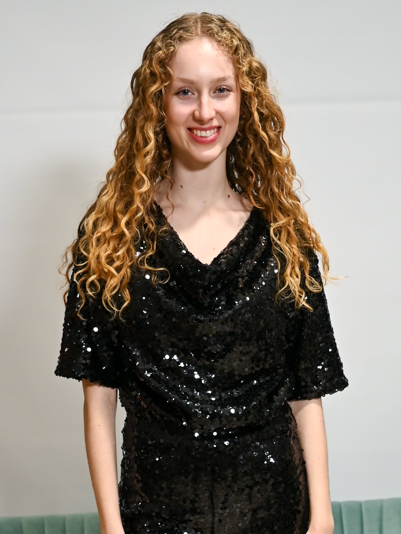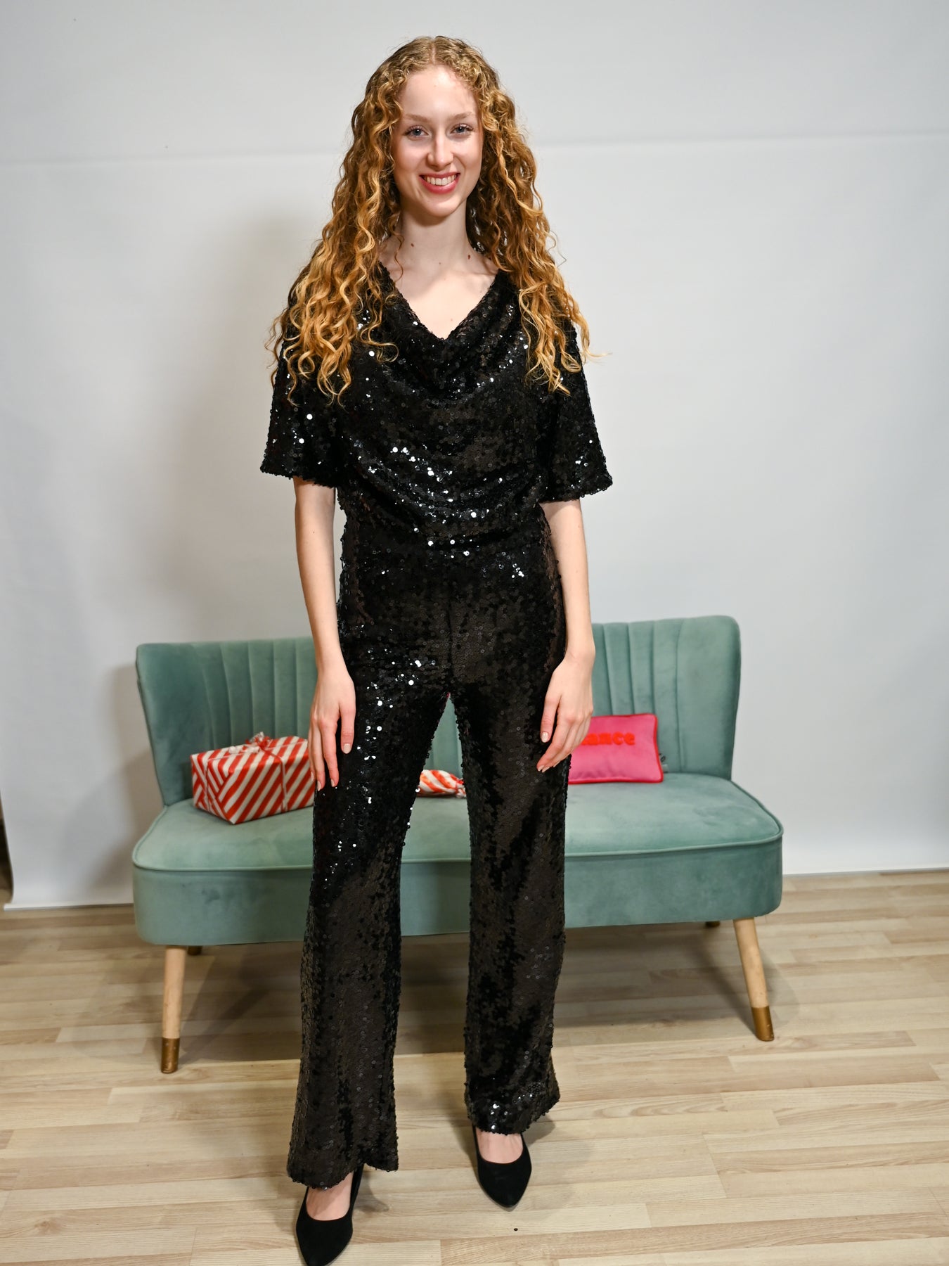 Das Paillettenshirt Wasserfall Halbarm Schwarz ist bei Modafein erhältlich.