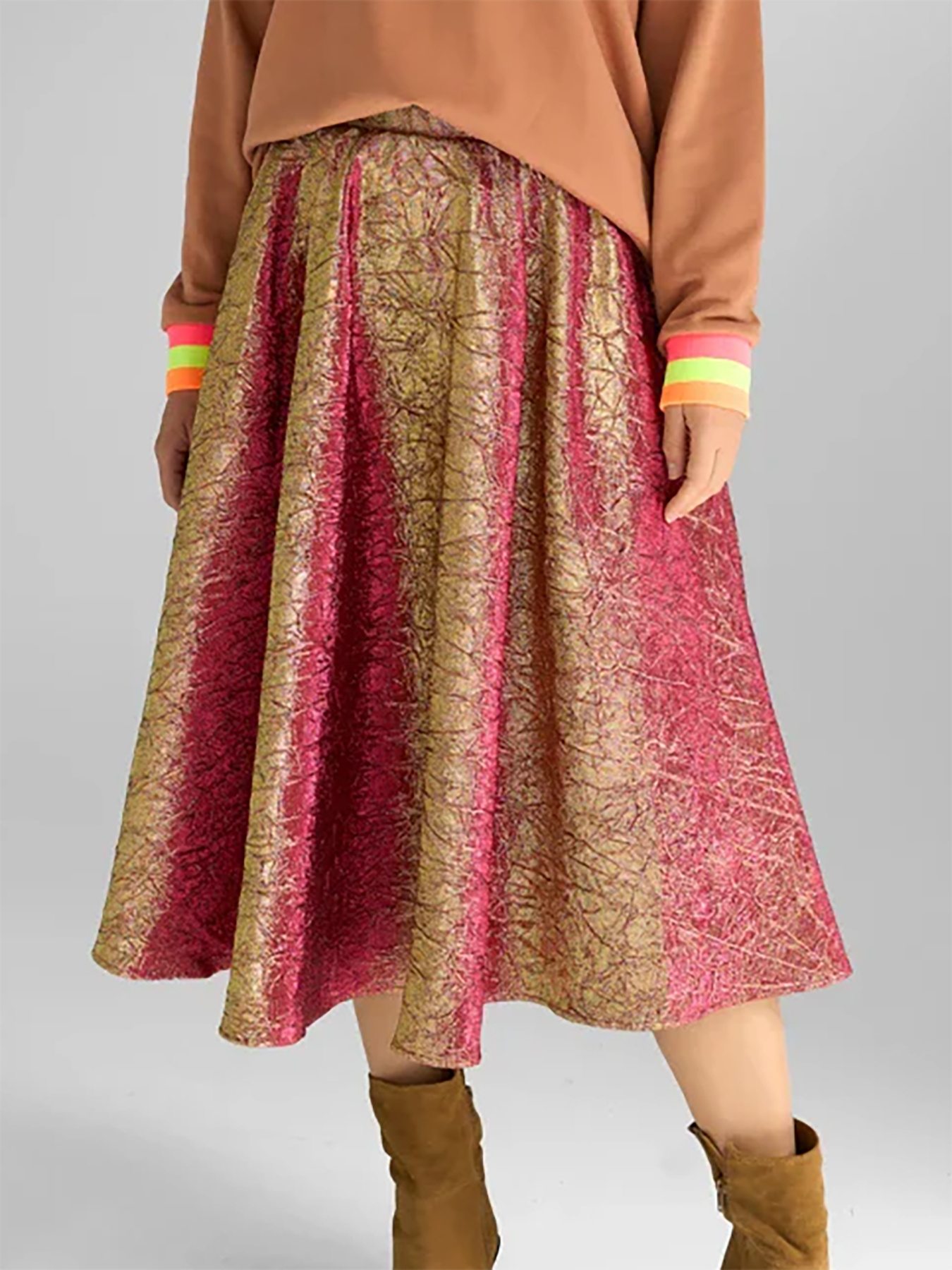 Dieser Midirock in Gold und Pink kombiniert Glanz, Farbe und Struktur zu einem einzigartigen Statement-Piece. Der weich fließende Schnitt in A-Linie bringt Dynamik in deinen Style, während der elastische Bund für maximalen Tragekomfort sorgt.