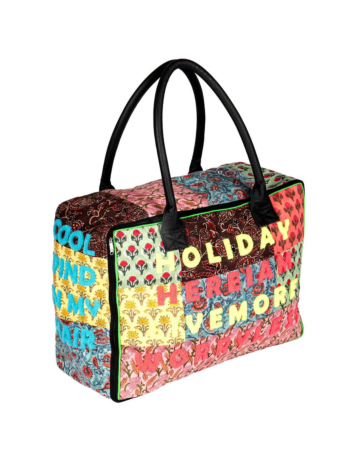 Der coole Weekender des Labels Pad überzeugt durch seine große Öffnung per Reißverschluss, seinem Patchwork Design und den lustigen Statements auf jeder Seite