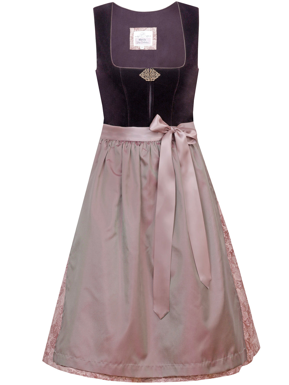 Entdecke das zauberhafte Midi Samtdirndl Katja in der schicken Farbe Schokotraube (eine coole Mischung aus Lila und Braun) von Marjo Trachten. Mit einer Länge von 68 cm punktet dieses Dirndl mit seinem weichen Samtstoff und der eleganten Schließe am Dekolleté.