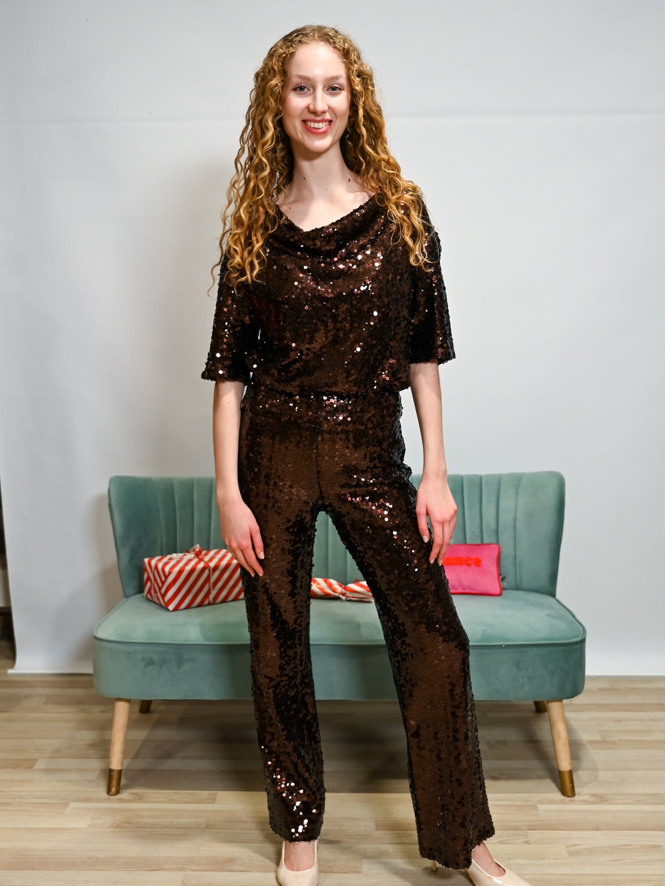 Das Paillettenshirt Wasserfall Halbarm Braun ist bei Modafein erhältlich.